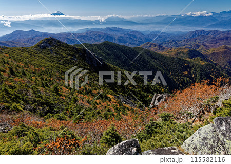 秋色の金峰山稜線から見る瑞牆山と八ヶ岳