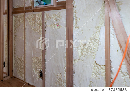 吹付け断熱を施した新築一戸建ての工事現場の壁