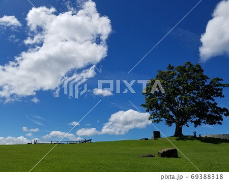 神奈川県二宮町の初秋の吾妻山の頂に浮かぶ白い雲と青い空【9月】
