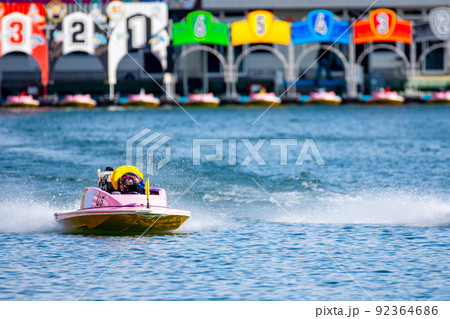 水しぶきを上げながらコーナーを曲がるボートレースの選手