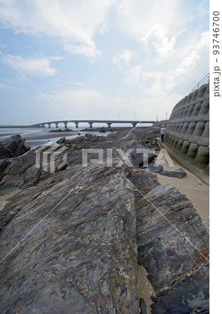 福岡県行橋市の長寿大橋と海岸の周防変成岩
