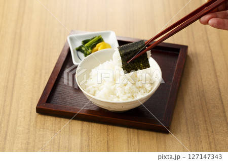 味付け海苔でご飯を食べる朝食