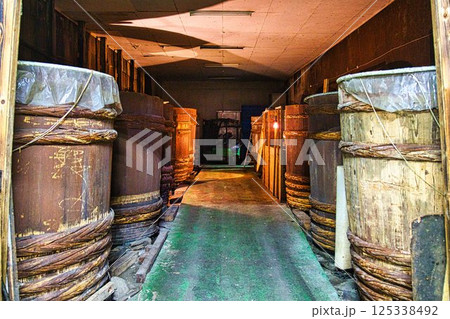 巨大な樽が置かれた味噌蔵