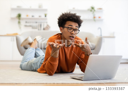 A young man with glasses lies on the floor, engaged in a video call on his laptop, gesturing with his hands.