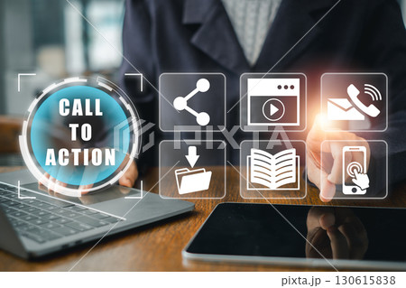 Business professional interacting with digital call to action icons, symbolizing marketing and engagement strategies.