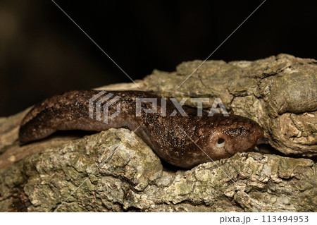 生き物 軟体動物 ヤンバルナメクジ 伸びると十センチを超える。側面の穴は呼吸孔・排泄孔のようです