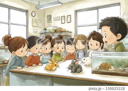 子どもたちが飼育しているウサギや小動物を観察する授業