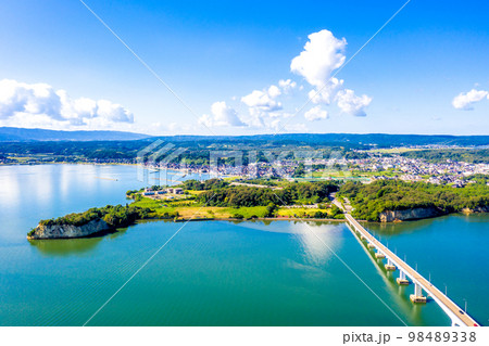能登島大橋と和倉温泉の屏風岬、七尾湾(石川県)