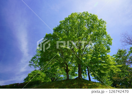五月晴れの日・京都和束荘のケヤキの大木を広角で見上げる