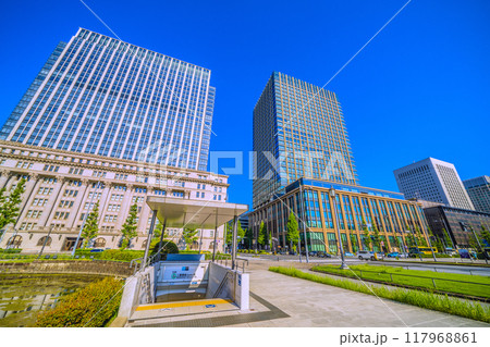 日本の東京都市景観 二重橋前(丸の内)駅出入口2や馬場先門などを望む。左奥は大手町方向