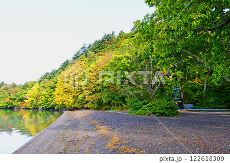 青森県 十和田湖 西湖 御前ケ浜から臨む恵比寿・大黒島 風景、景色、10月、空、晴れ、青空、秋、朝、