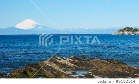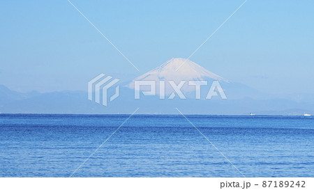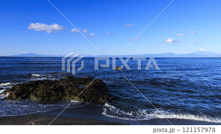 和田長浜海岸から見た相模湾と冠雪の富士山(冬)