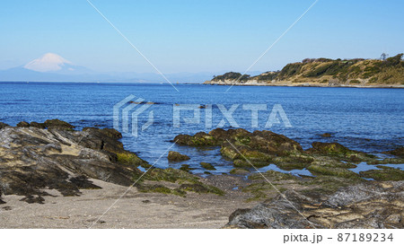 和田長浜海岸から見た相模湾と冠雪の富士山(冬)