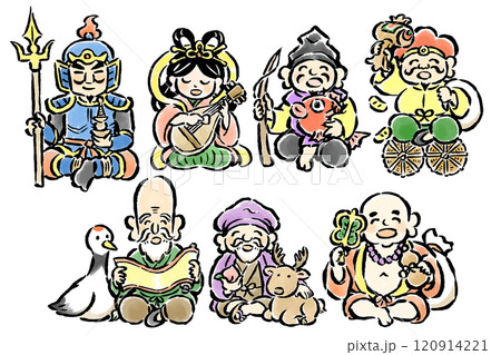 七福神 筆タッチ手描き 座りポーズイラストセット