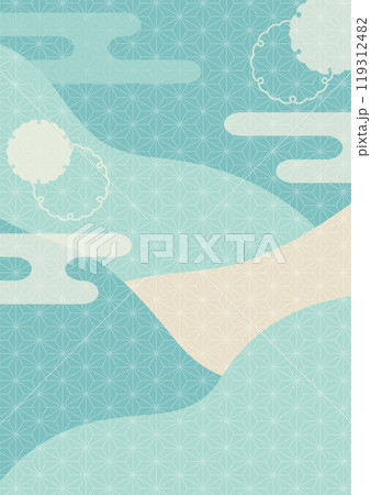青緑の和風背景。山々と麻の葉模様、エ霞、雪輪のベクターイラスト。縦。