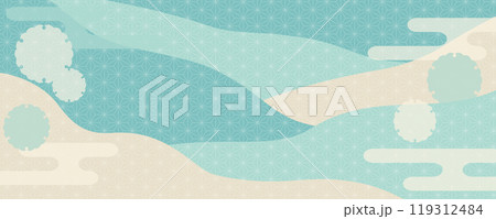 青緑の和風背景。山々と麻の葉模様、エ霞、雪輪のベクターイラスト。横。