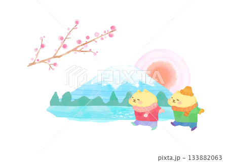 新年 富士山の初日の出を楽しむかわいい猫の水彩イラスト素材
