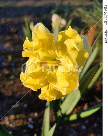 Large large yellow narcissus flower on green stem with green leaves growing in black ground on sunny spring day. Cultivated varietal flower daffodil. Blooming flower, petals and stamens. Plants nature