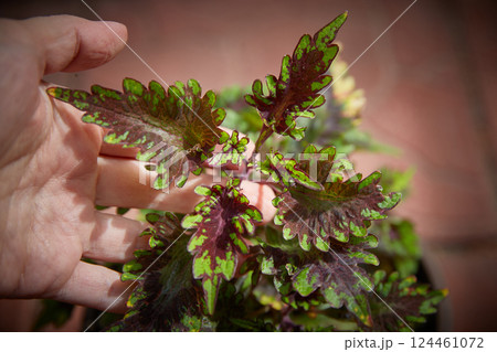 Coleus Blumei Plectranthus scutellarioides. Name of the plant variety Caracas. Coleus leaves in hand close-up.