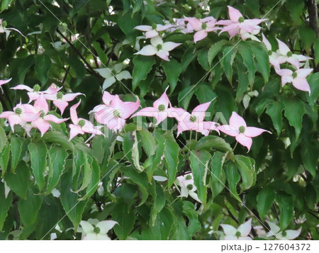 ピンク色のヤマボウシの花のクローズアップ写真・春の庭の花