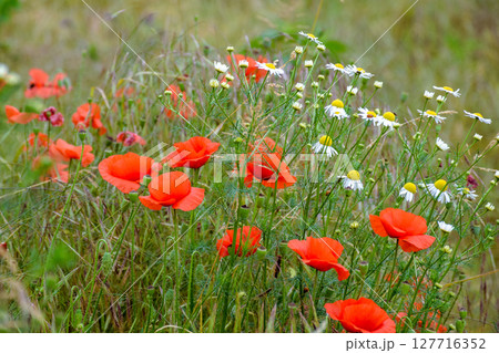 red poppy flower bloom in summer. beautiful meadow somewhere in ukrainian countryside. outdoor closeup photography. floral background of the garden. idyllic rural freshness