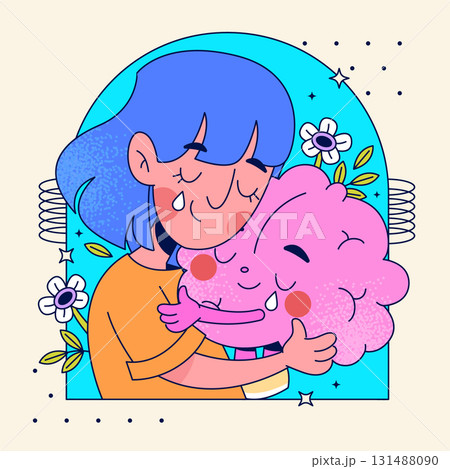 Emotional Hug Between Girl and Brain with Flowers and Tears of Healing Composition