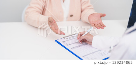 senior woman consulting with doctor in hospital. Elderly patient talking and sharing disease. Doctor listens, asking question and taking note. medical consultation and geriatric Healthcare concept