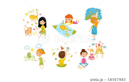 Small Kids Painting On Paper With Paints Vector Illustration Set