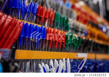 Showcase with pens office or school writing supplies at stationery store