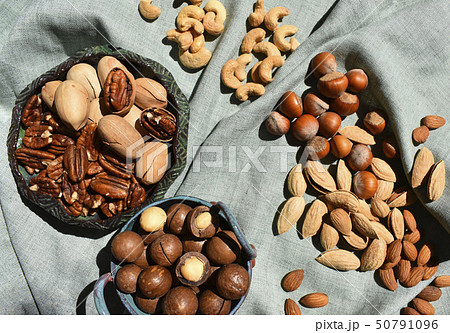 Different nut variety in ceramic bowl. Unpeeled macadamia, cashew, hazelnut in shell deep green