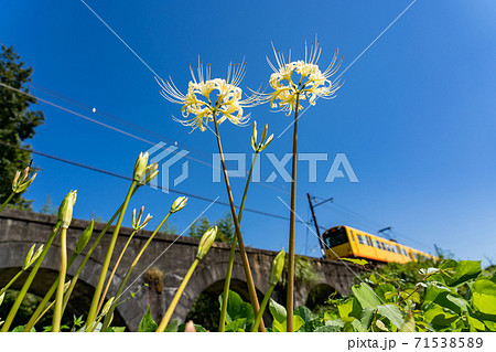 三重県いなべ市 北勢線のめがね橋を通り過ぎる黄色い電車と白い彼岸花