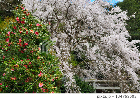 大豊神社 本殿 満開の枝垂れ桜と枝垂れ紅梅と椿