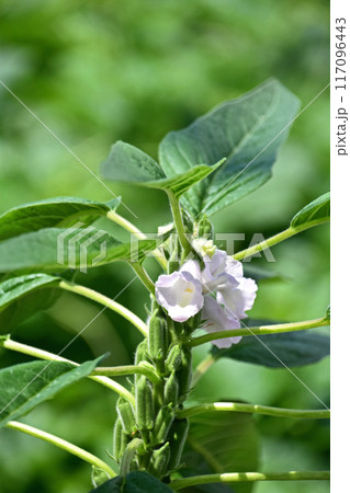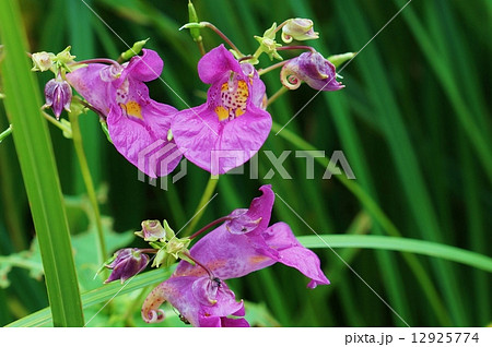 夏の野の花・ムラサキツリフネ(ツリフネソウ)の鮮やかな花と若い種子・横位置アップ