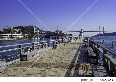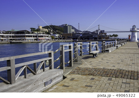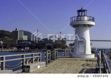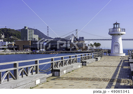山口 下関 関門海峡 関門橋と唐戸市場 唐戸桟橋防波堤 紅白恋人灯台