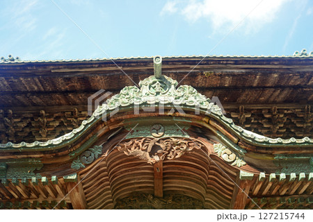 唐破風屋根(向拝を)支える庇部の彫刻、瑞泉寺太子堂、富山県井波