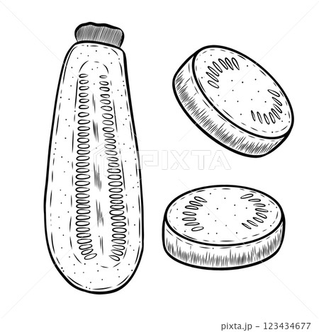 Vector illustration of zucchini, slices. Hand drawn vegetables and fresh healthy food. Farm product. Black and white illustration for menu design, textiles, recipes. Isolated on a white background.