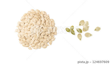 Whole Pumpkin Seeds in Shell Isolated, Raw Pepita Grains, Scattered Green Healthy Nuts