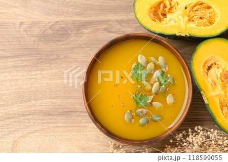 Pumpkin soup in wooden bowl, Homemade food in autumn season, Table top view