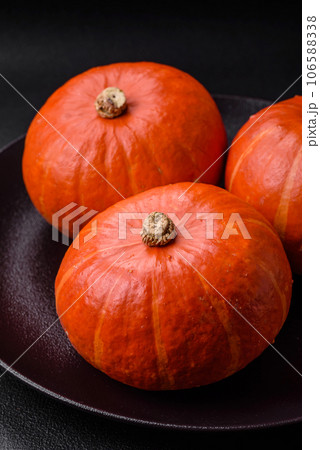 Beautiful fresh round pumpkins in orange color on a dark concrete background