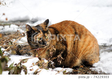 初めての雪に興味津々のサビ猫