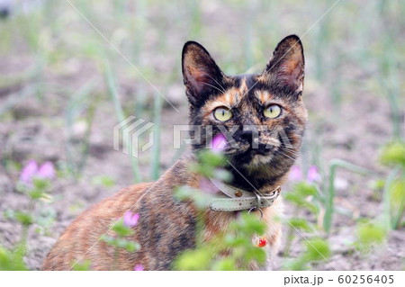 花壇に座るサビ猫