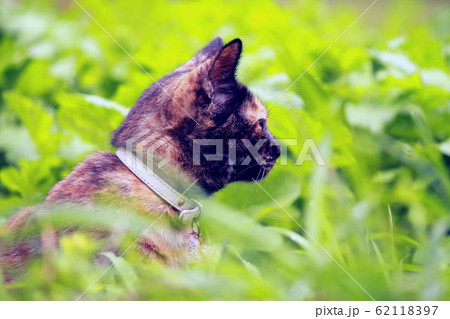 草むらをウロウロするサビ猫