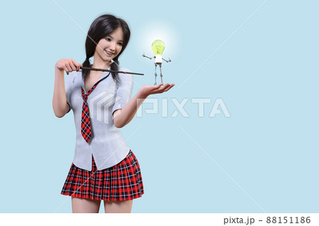 赤いチェックのネクタイとスカートを履いた女子高生が魔法の杖で手のひらに乗せた電球の人形に発光する呪文