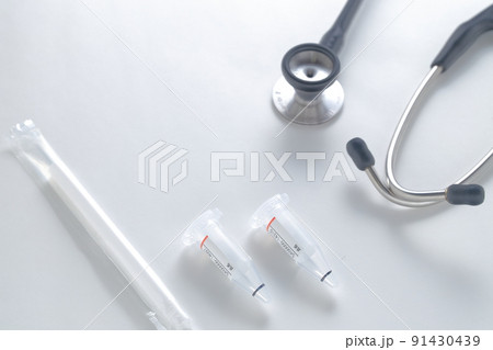 唾液検査キット 検査イメージ(唾液容器、聴診器)