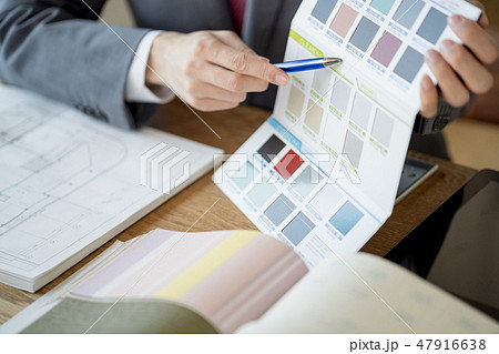 お客様へ色見本を提示し内装の提案をする設計事務所の一級建築士男性ビジネスマン