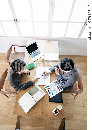俯瞰撮影リフォームの打ち合わせで色見本を提示し間取りと内装の打ち合わせをする男性ビジネスマン