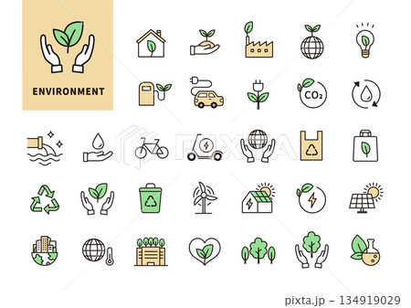 エコフレンドリーで持続可能な暮らしを表すシンプルなアイコンセット