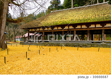 新宮熊野神社 長床の大銀杏と女性 福島県喜多方市