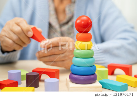 Alzheimer disease AD, Asian elderly woman patient suffering from dementia learn practical motor skills rehabilitation.