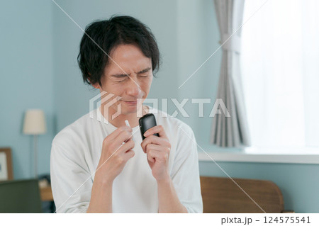 タバコを持つ男性の手元 喫煙者 煙草を部屋で吸うイメージ写真素材